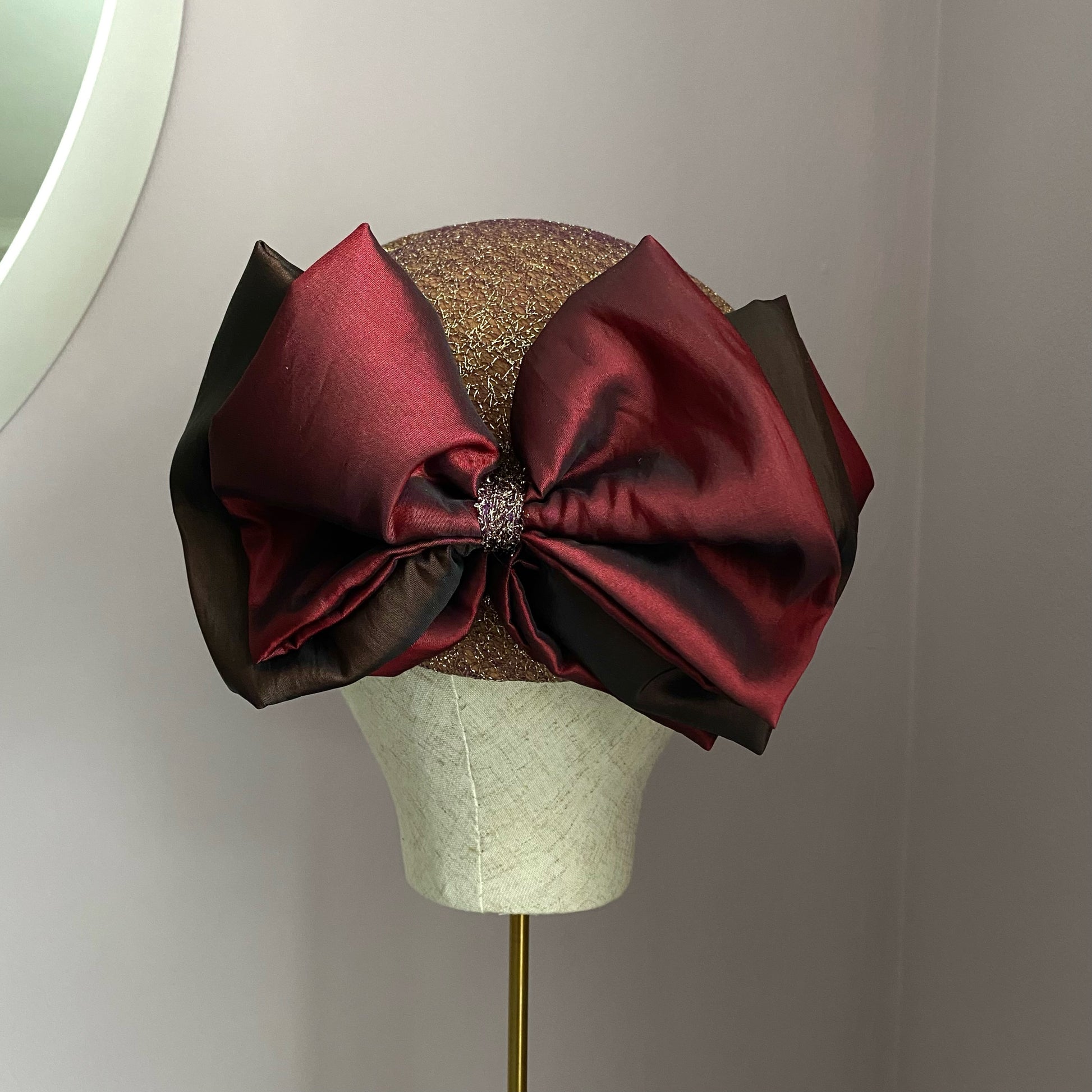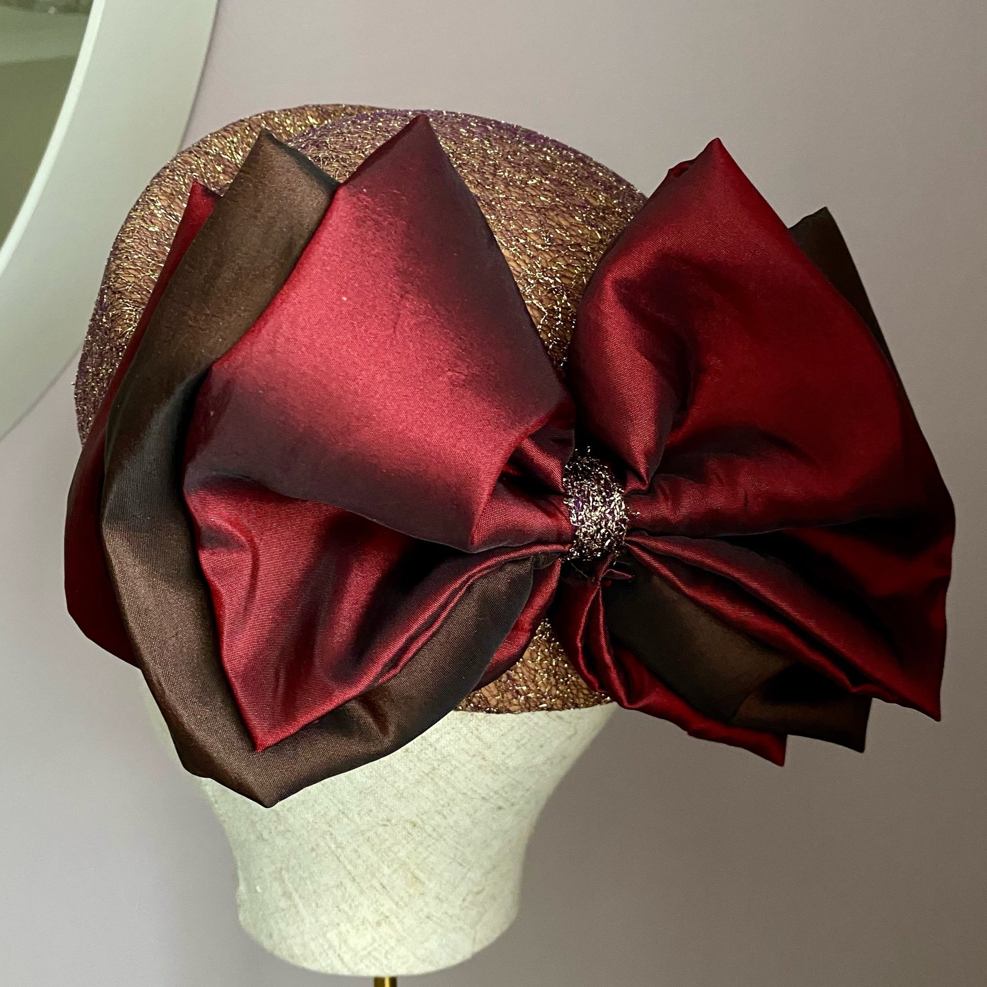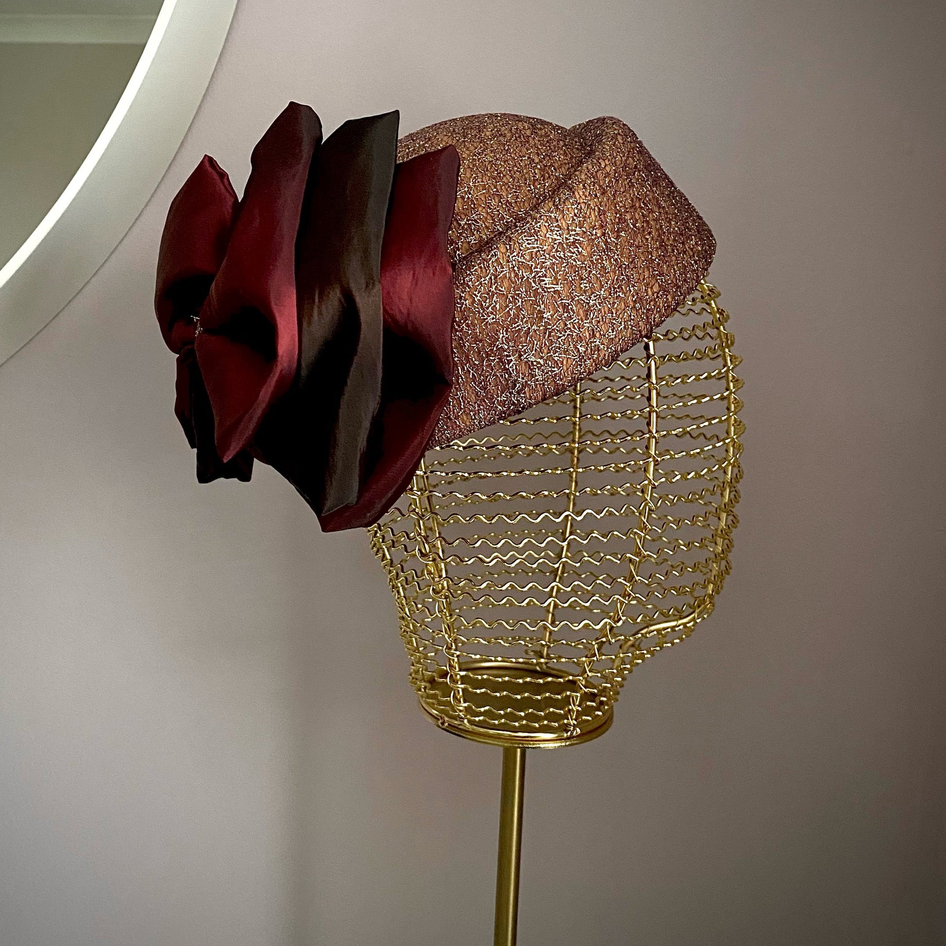 A gold pillbox hat, that sits on the crown. With a stunning chocolate brown and wine colour scheme, this classic headpiece is perfect for formal occasions. The standout bow decoration at the back adds a stylish touch seamlessly blending modern flair with timeless sophistication.