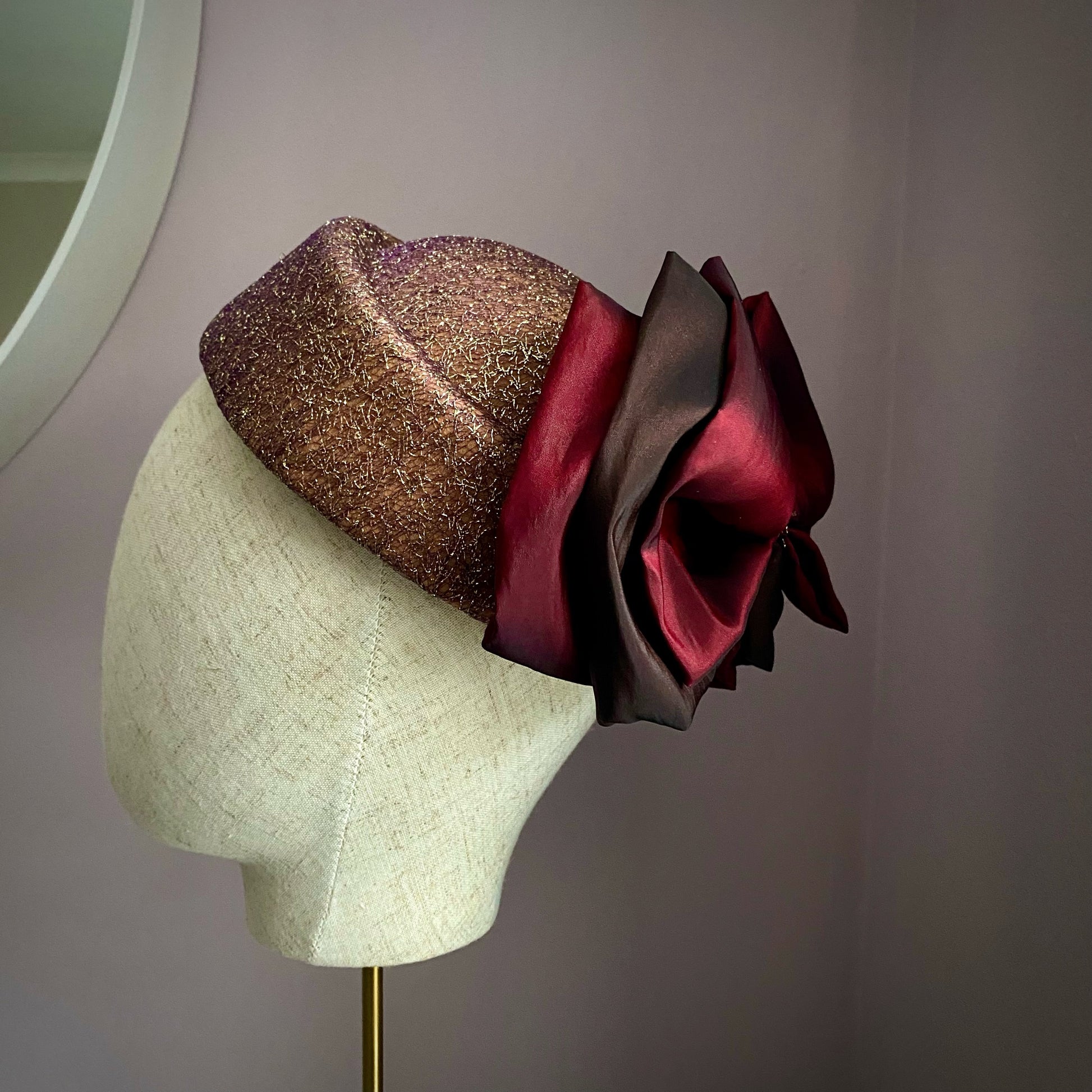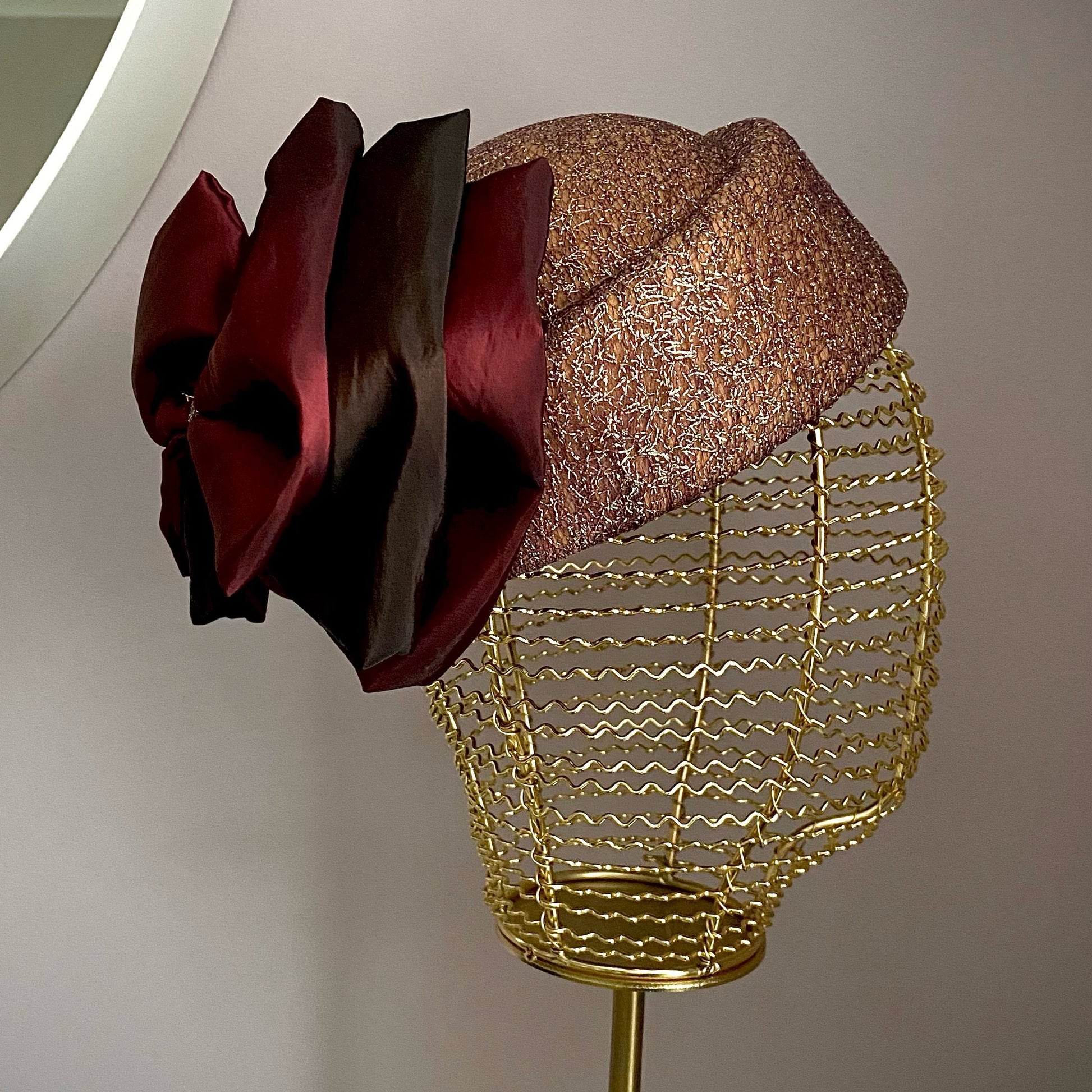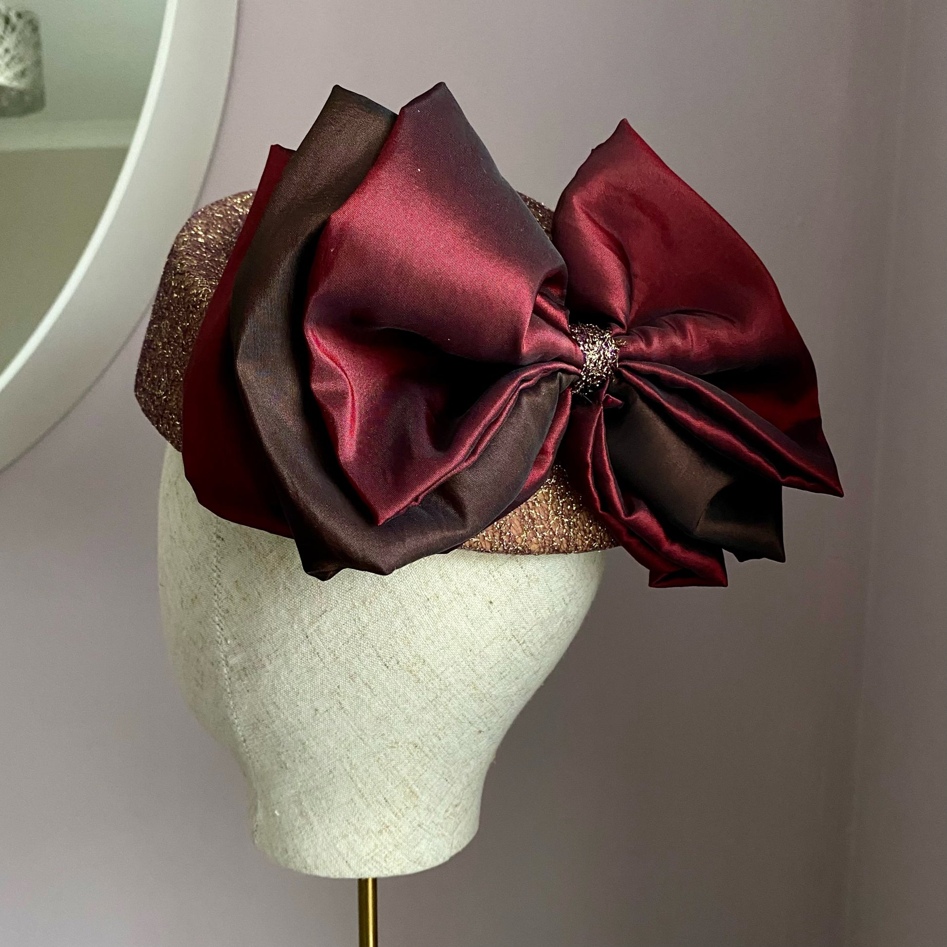 A gold pillbox hat, that sits on the crown. With a stunning chocolate brown and wine colour scheme, this classic headpiece is perfect for formal occasions. The standout bow decoration at the back adds a stylish touch seamlessly blending modern flair with timeless sophistication.
