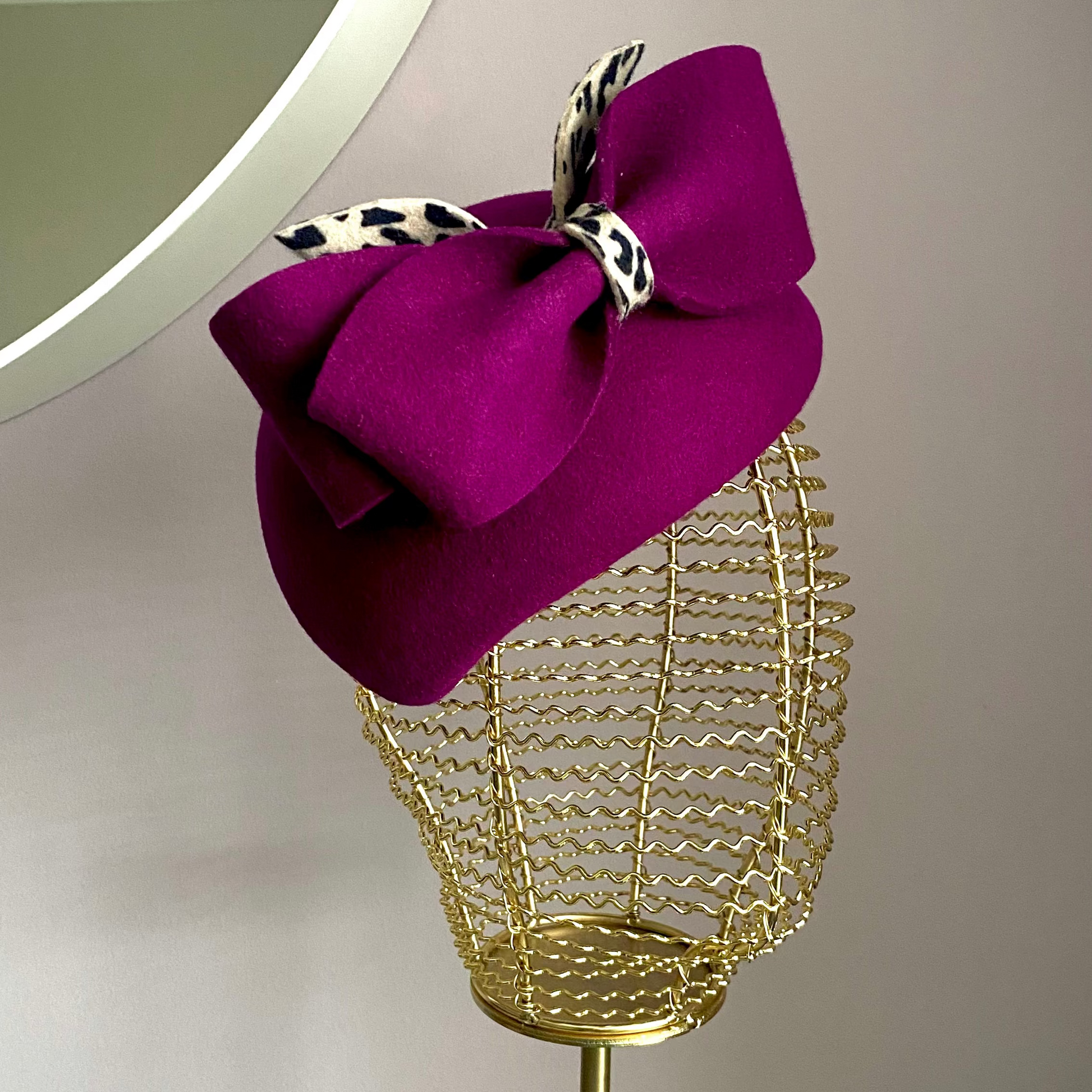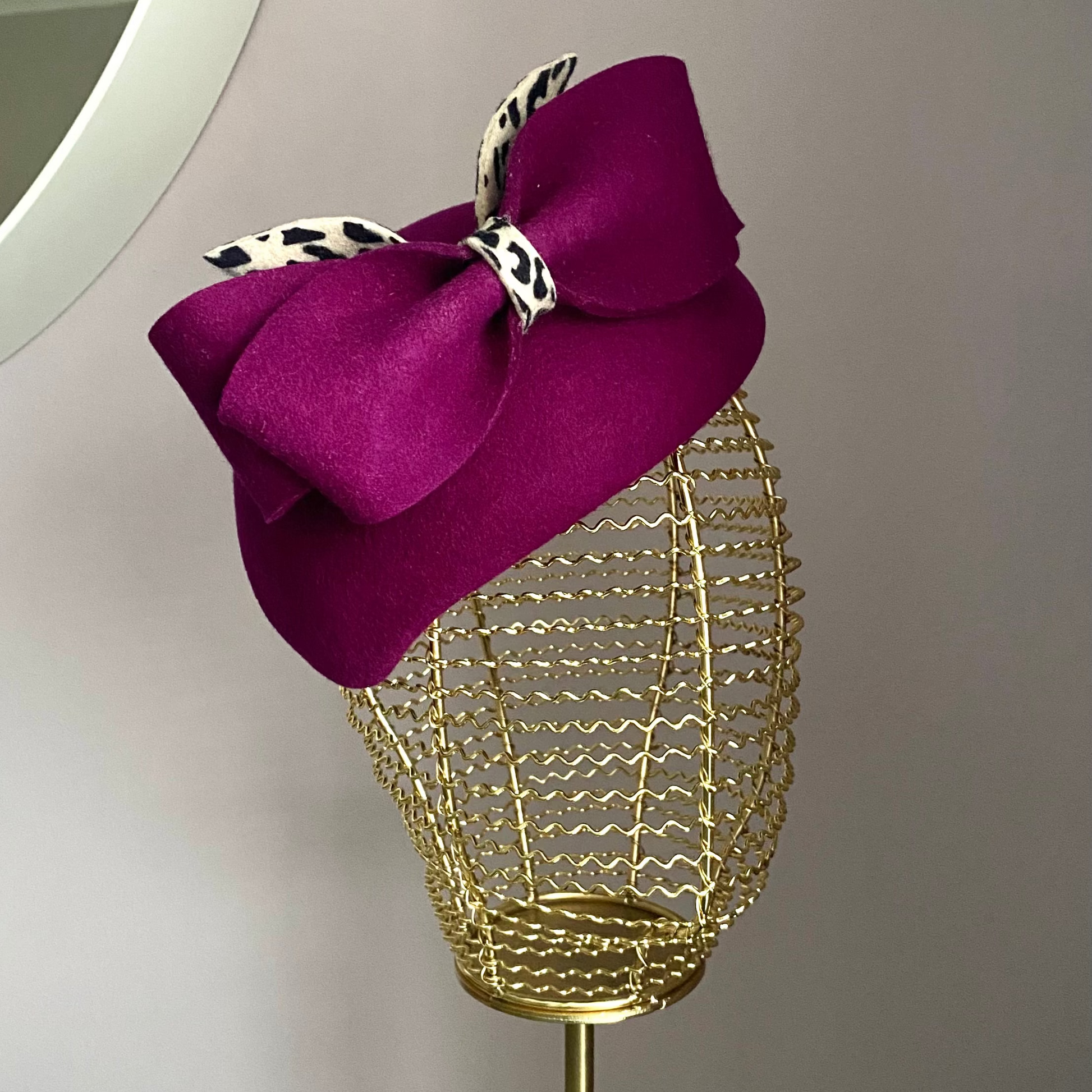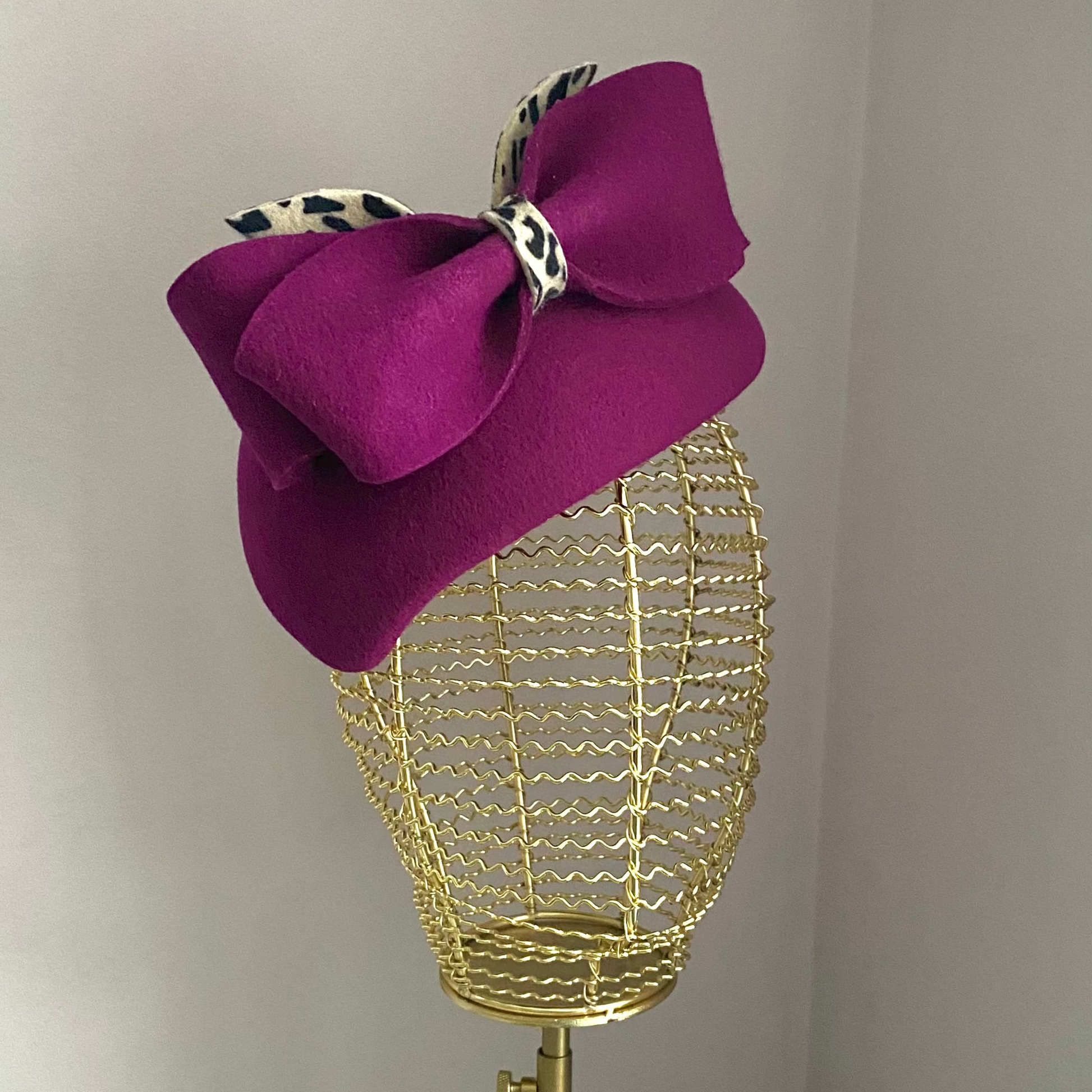 Introducing our stunning magenta felt headpiece, designed in an elegant teardrop shape that gently hugs the side of the head. This chic accessory features a double bow adorned with a touch of animal print felt, adding a unique flair to the design. Timeless and sophisticated, this headpiece is the perfect choice for any winter horse racing events and winter weddings.