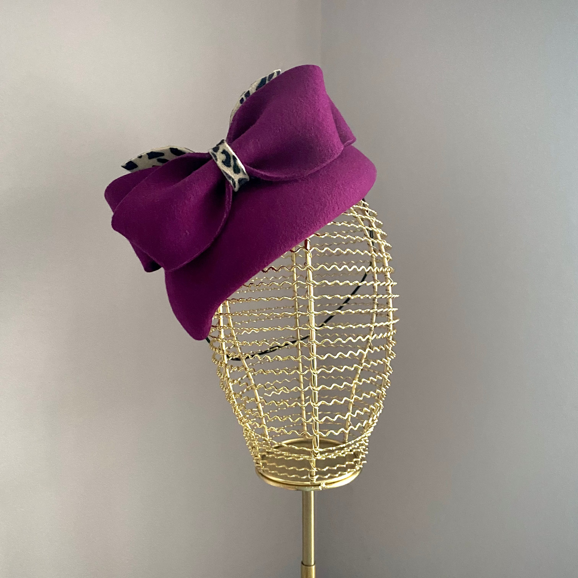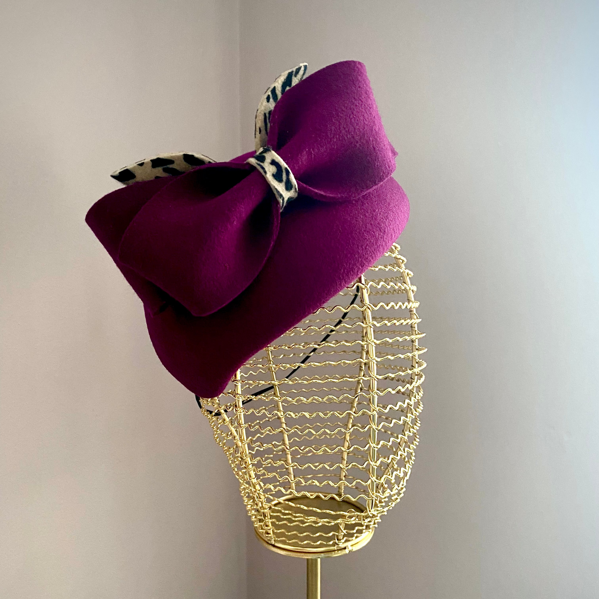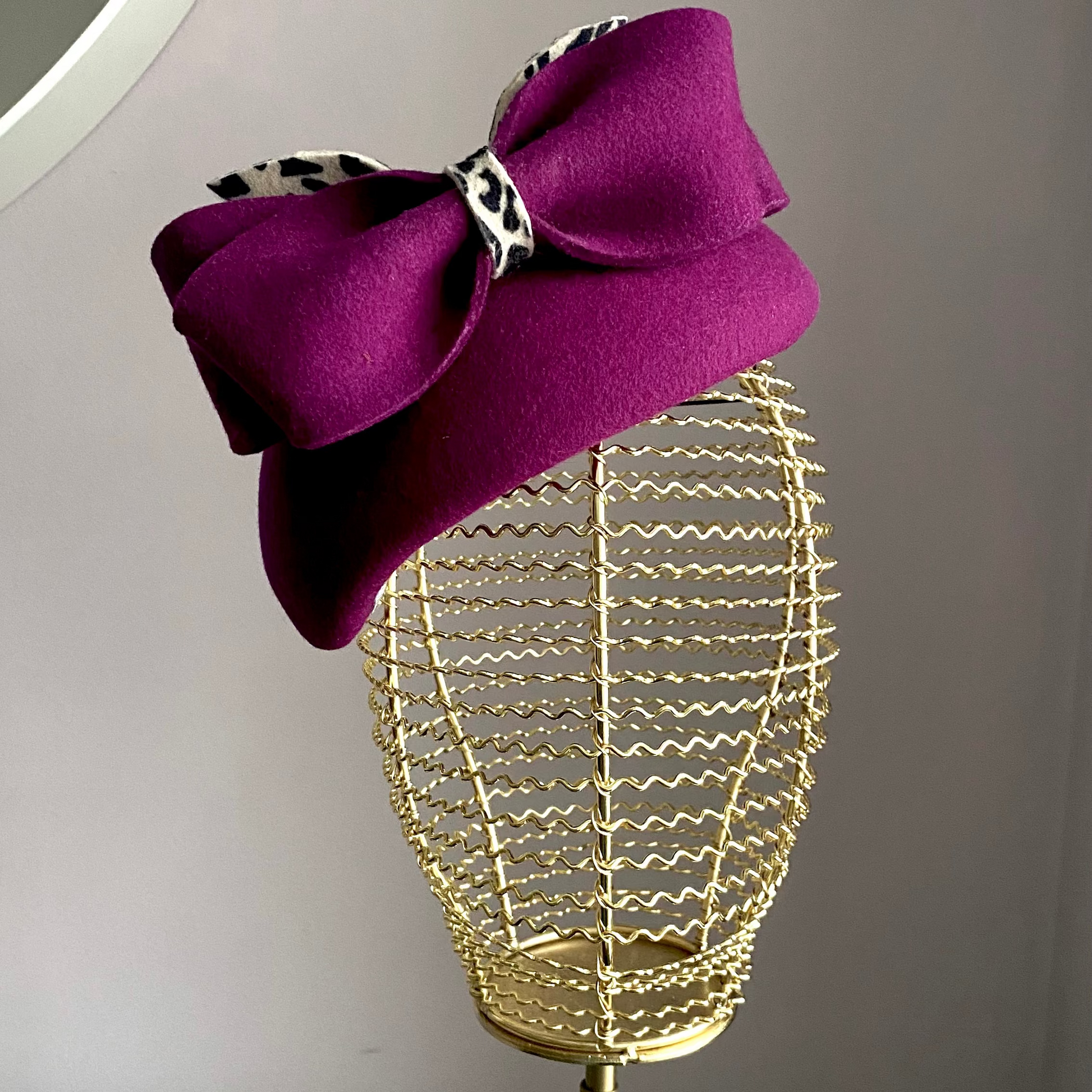 Introducing our stunning magenta felt headpiece, designed in an elegant teardrop shape that gently hugs the side of the head. This chic accessory features a double bow adorned with a touch of animal print felt, adding a unique flair to the design. Timeless and sophisticated, this headpiece is the perfect choice for any winter horse racing events and winter weddings.