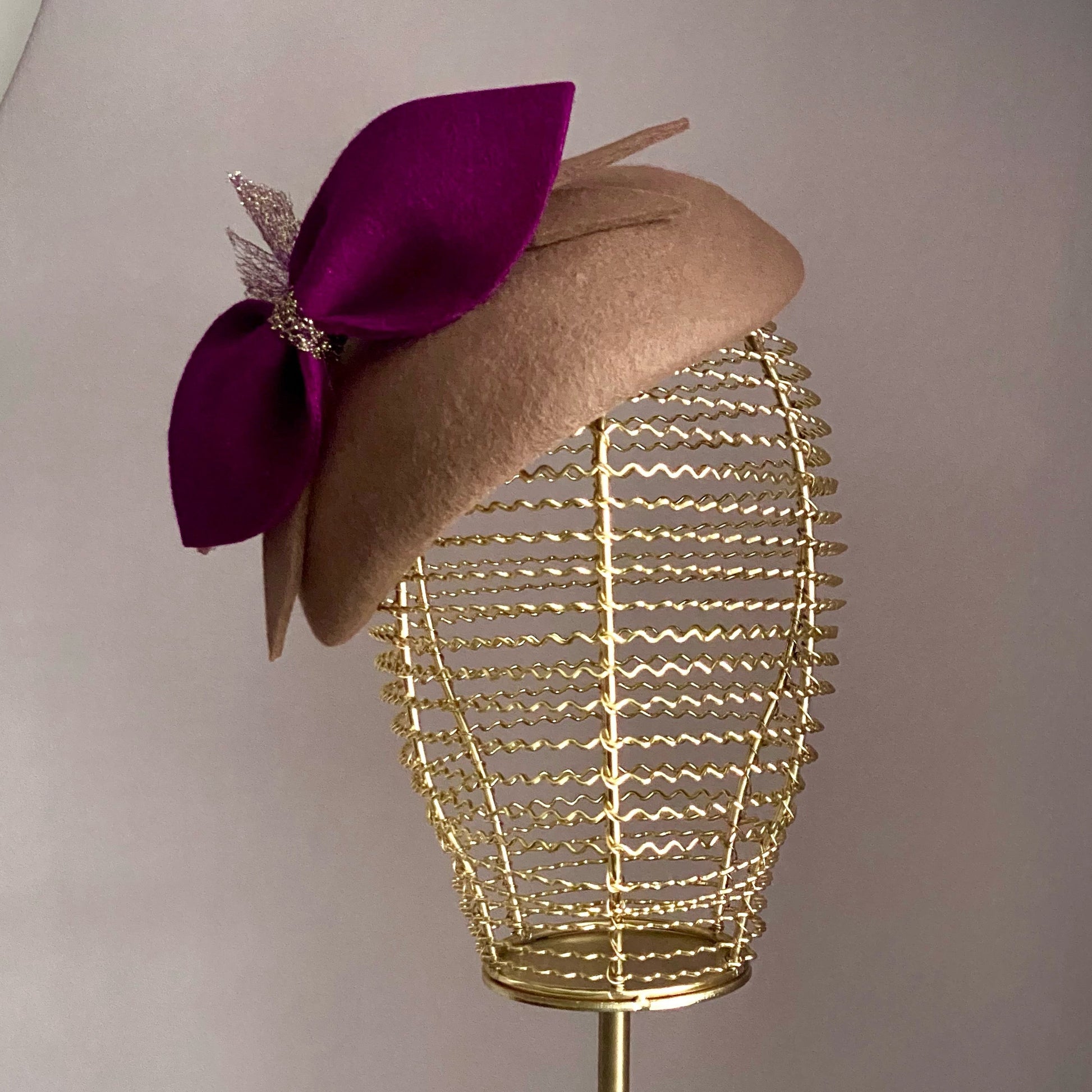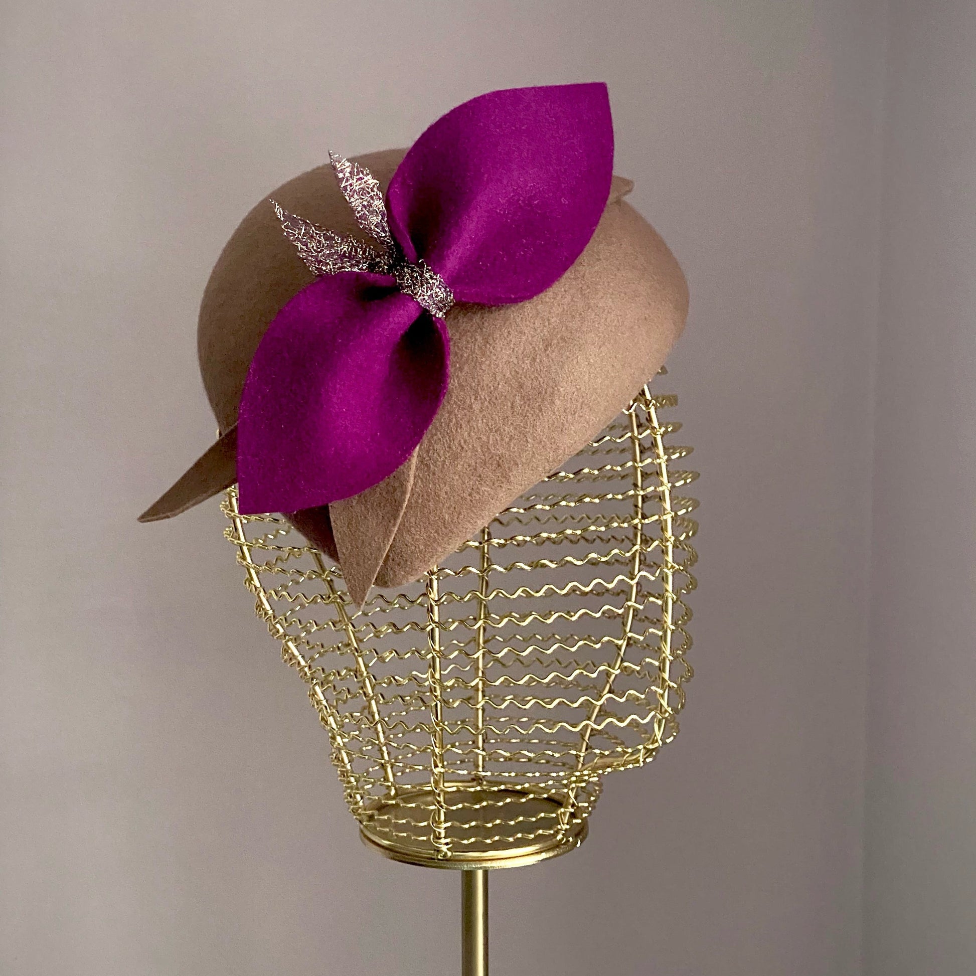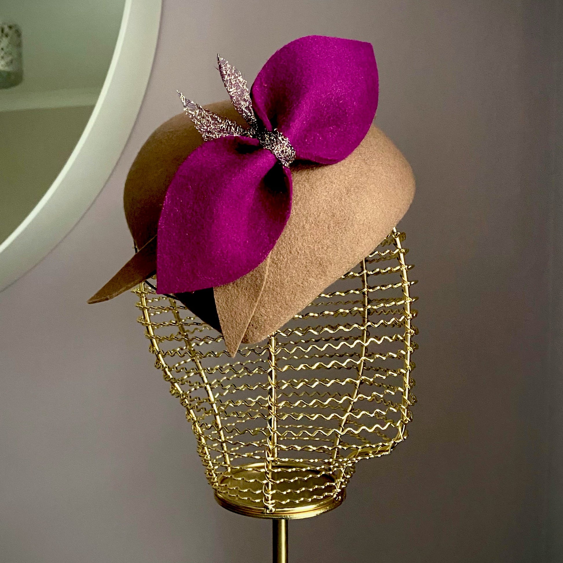 A felt teardrop headpiece, crafted from luxurious felt in a rich camel colour, this sophisticated accessory features a striking contrasting magenta bow with a splash og gold that adds height and visual interest.