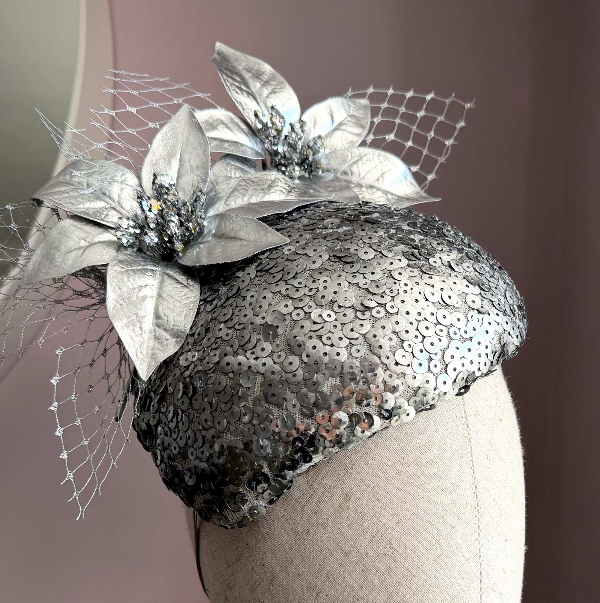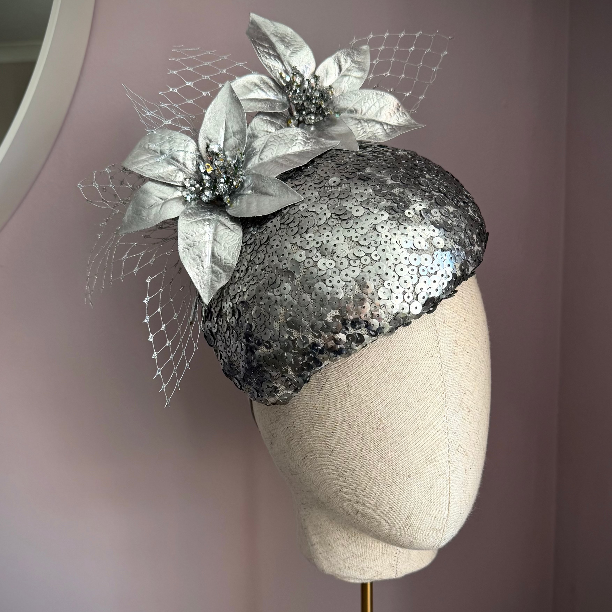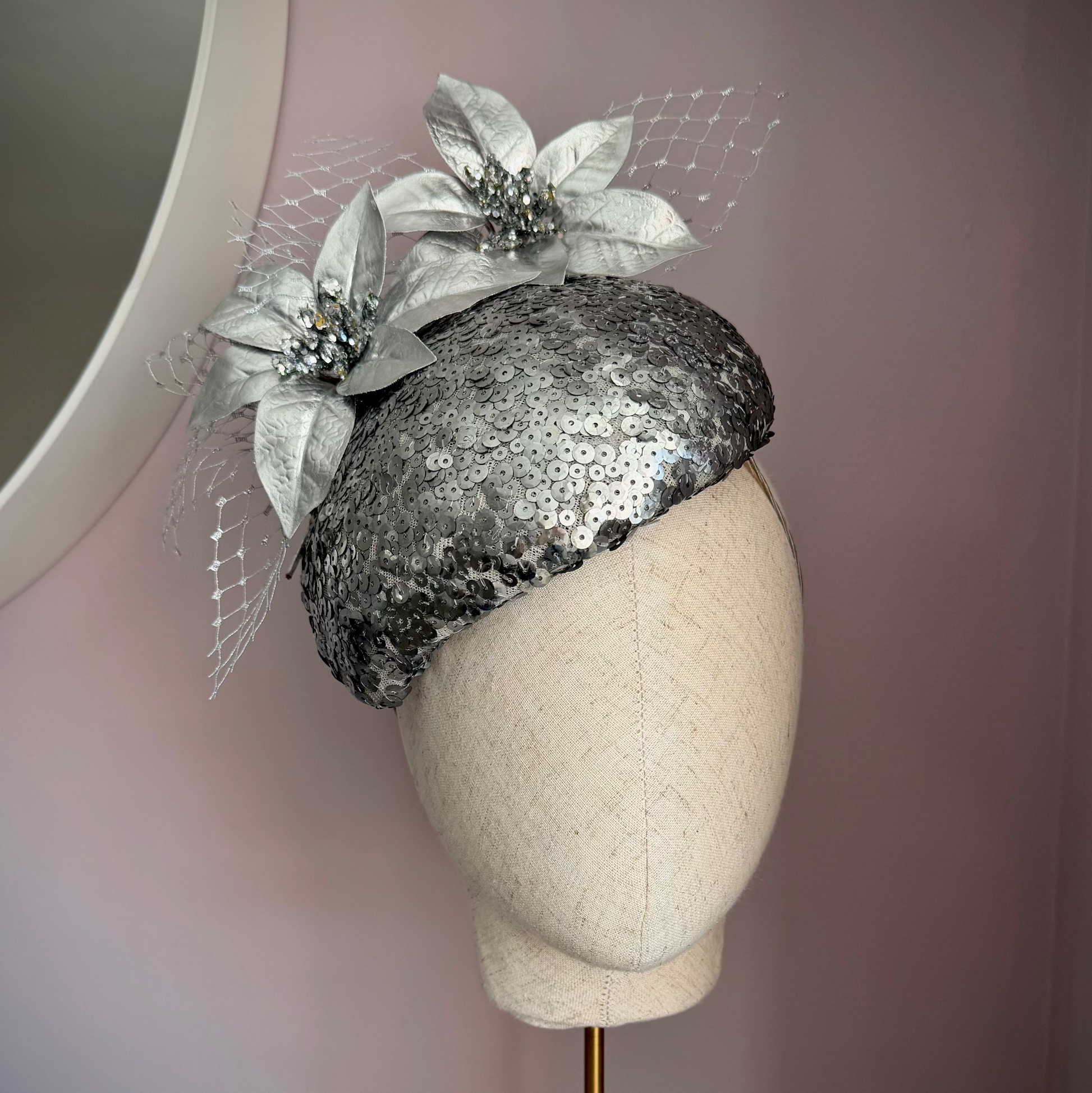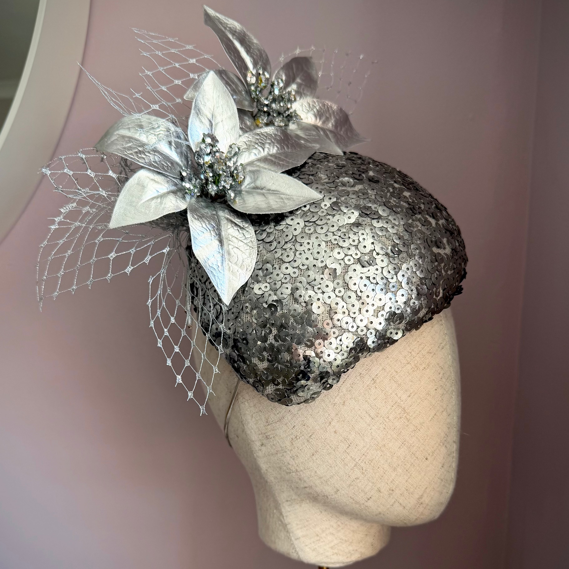 A striking teardrop percher designed to sit elegantly to the side of the head, with a flattering tilt for a truly sophisticated silhouette. This bespoke, fully sequin headpiece is a statement in glamour, catching the light beautifully with every movement.